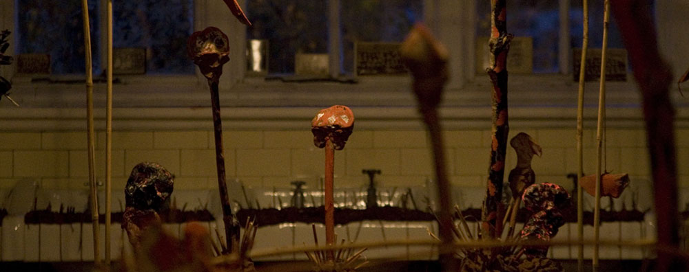 An eight hour non stop performance/installation at Chapter Arts Centre, Cardiff – part of Experimentica ’08 Festival of Live Art. I created an environment using clay, red ochre pigment, sticks, petrified tree fungi, paint and leather skins (which I painted upon and wore). The performance utlised an old wash room that had not been modernised or decorated for many years. The space was long and narrow with many windows, some of which I painted over the panes and etched or drew onto with an engraving needle and my fingernails. For long periods I balanced a very heavy wooden tree branch on my head, which acted as a sort of pendulum and controlled my breathing, pace and movements throughout the performance. A series of drawings on table tops in wet paint indicated the passage of hours rather like tree rings record years. I made other paintings on paper sheets fixed to the walls, with pure iron oxide. Photographs by Anna Hillman.