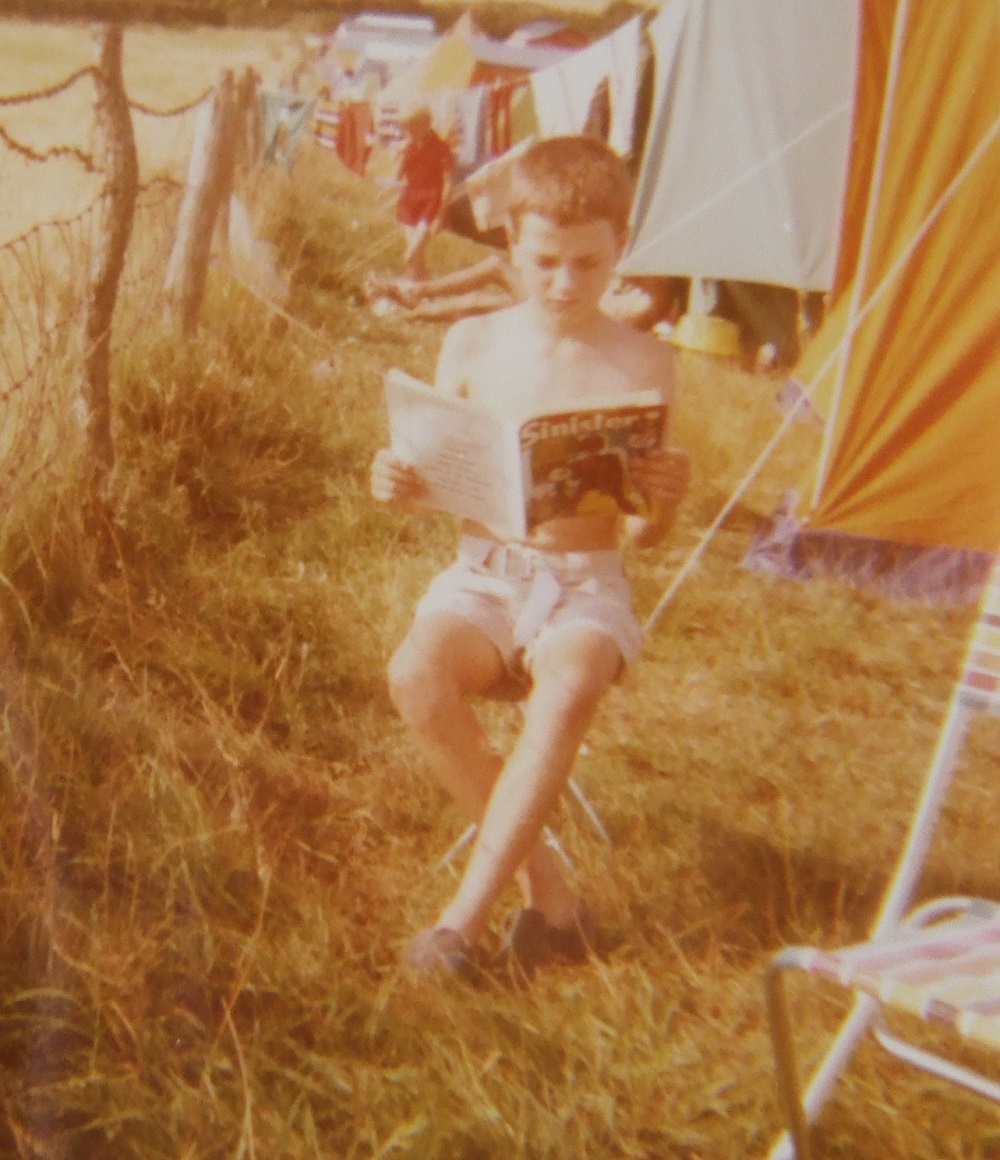Years of possibly quite useless study and training have led me to a complete unlearning process, in which I have evolved my own visual vocabulary which is still expanding and leaching out to find a habitable ledge or plateau. I call this process: edible darkness of pink machinery. However, the vituperative ignoramus will always be quick to say, ‘that reminds me of so and so’ with a smug little smile rehearsed and refined many times at preparatory school, as if to reiterate their own banal lack of engagement with a painting or drawing. The custom that such superior people should patronise an artist by coming up with a trite comparison, no matter how vague or obtuse, will always be the tried and tested method by which an effete art dealer will spitefully attempt to undermine an artist’s efforts, no doubt, to show them who is the real supremo when it comes to art. Leaving aside the rampant snobbery and toxic digressions for which an entirely devoted study along these lines should be assiduously devoted, I must now recall with some fondness, as a method of salvaging this essay from the existential void it veers towards, the cherished scribbles of my childhood. These were influenced by a deep rooted fascination with the gruesome horror cartoon strips published by the infamous EC comics. Such graphic stories were considered too sick and twisted for juvenile minds by adults who were probably already significantly depraved enough, and the comics were summarily banned in the USA. However, I was quick to learn that things which are often censored often have the habit of resurfacing, and are easy enough to intercept given the right circumstance and a catalyst. Hours of secretive reading were spent at Mr G’s newsagent shop – a completely filthy, obsessively cluttered little room, illuminated by a single yellow light bulb hanging from a cobwebbed wire impregnated with decades of grime and frazzled bluebottle cadavers. The portly, spectacled, G, sported an interesting array of crusted canteen medals, dribbled and meandering to form rivulets of congealed soup, tributaries of tea, and trickled sauces forming a sluggish delta fanning out down the front of his sweater, where one could usually discern what he had been gorging the night before by scrutinising the bifurcations of bilge. Frequently ensconced in venomous bickering matches with his long suffering wife, G paid no attention to the morbid predilections of a boy rifling through toppling piles of comics. As the insults and opprobrium were traded back and forth with increasing drama and volume, I entered an immersive world of fantasy, science fiction and terror, through the ghoulish pages, lurid captions, and macabre story lines about death, disfigurement, dismemberment, and zombification. How I longed to be a character in those elegantly stylised and cross hatched 1950’s pen and ink stories! I often fantasised about the chubby, balding, Hugo Klagg, imprisoned in his impenetrable atomic bunker, waiting for an Armageddon that never came, or the stick-thin people that looked like reanimated corpses of the Arthur Grimsdyke variety (apologies to Tales of the Crypt ), who fed on live rats and lichen in tunnels beneath great dystopian cities in the year 2265 AD. This was the meat and grist of my real education, not the routine spoon-fed continuum of school, with its relentless repertoire of pea-brained lessons designed for a breed of barely human sub-species to learn by rote. I would visit this dingy hole in the wall every week and by the meagre light of that 40 watt bulb count out the sweaty, jangling coins, to see how many comics I could acquire. The chronologically challenging photograph below shows me as a young student of the outré reading a typical publication of this kind, reinforcing the psychological influence that such exposure would later have on my life and ‘work’ as an artist of ‘neo-noir psychological horror’*.